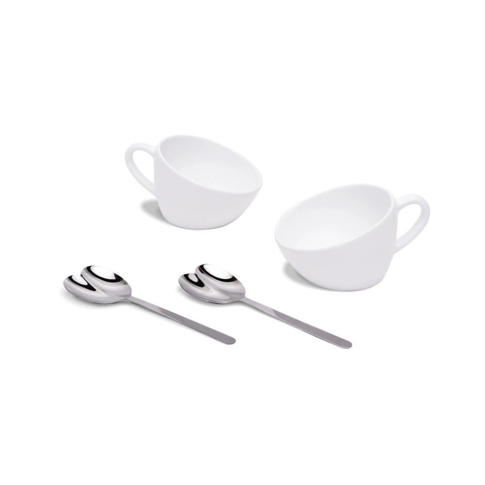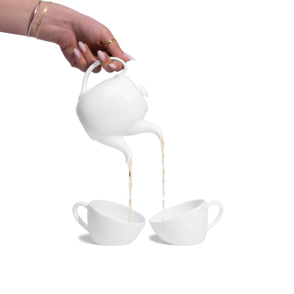 We have since collected many objects that relate to sharing. One of which is the espresso maker for two people by Gemini Express. It has served as an inspiration throughout the ideating and designing of this collection. Like the Gemini Express, our two-spouted teapot is sized perfectly for the two matching teacups, and pours both simultaneously.