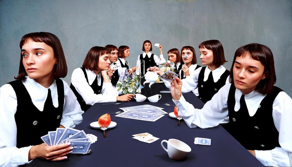 As a surrealist object collection, we set the stage for a world-build of the same kind. What would it look like to create our own Mad Hatter tea party, where everything is just a little bit off? (The pot has two spouts, the tea cups are just slanted enough to not spill, and the teaspoons have mutated into two).