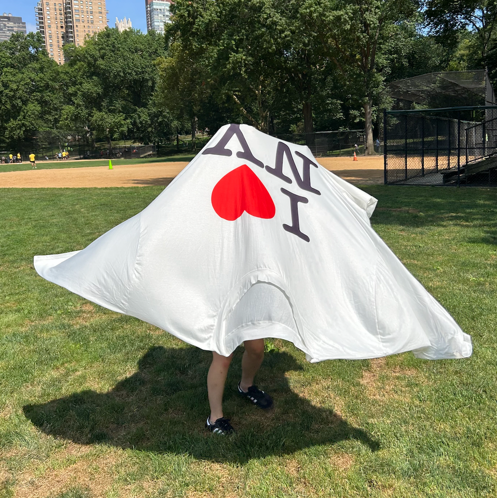 The two handbags take inspiration from surrealist objects, specifically where the work can imagine the object, in this case food, as a physical embodiment itself; one to be dressed and displayed. One example is Meret Oppenheim’s, Ma Gouvernante, imagining high heels as a whole chicken. Can objects be imagined as food, and food as an object? The picnic blanket is an homage to Milton Glaser’s iconic I <3 NY design. The enlargement of the t-shirt nods to each occurrence of an impromptu picnic; where you're all sharing whoever's extra t-shirt was in their bag, except this one is sized properly for 2-4. It's also large enough, and soft enough, to have a double life as a blanket.