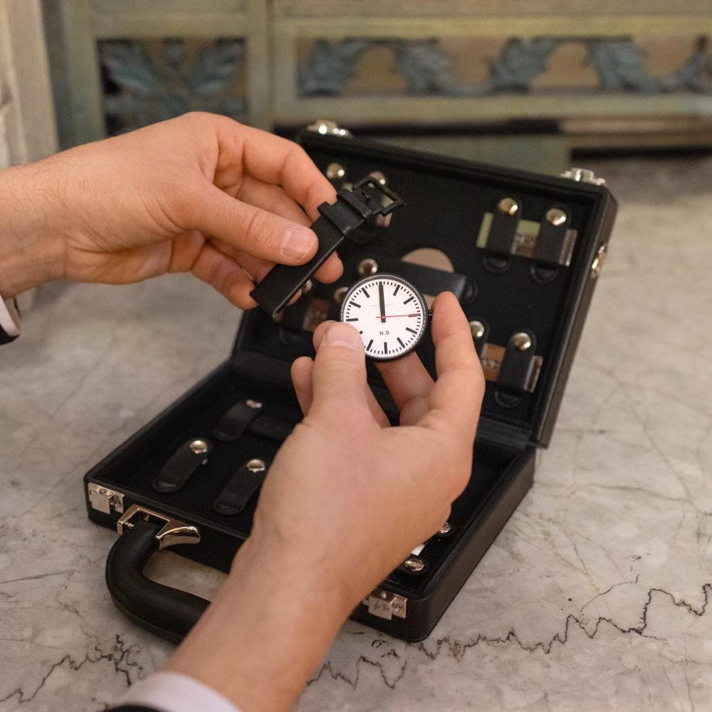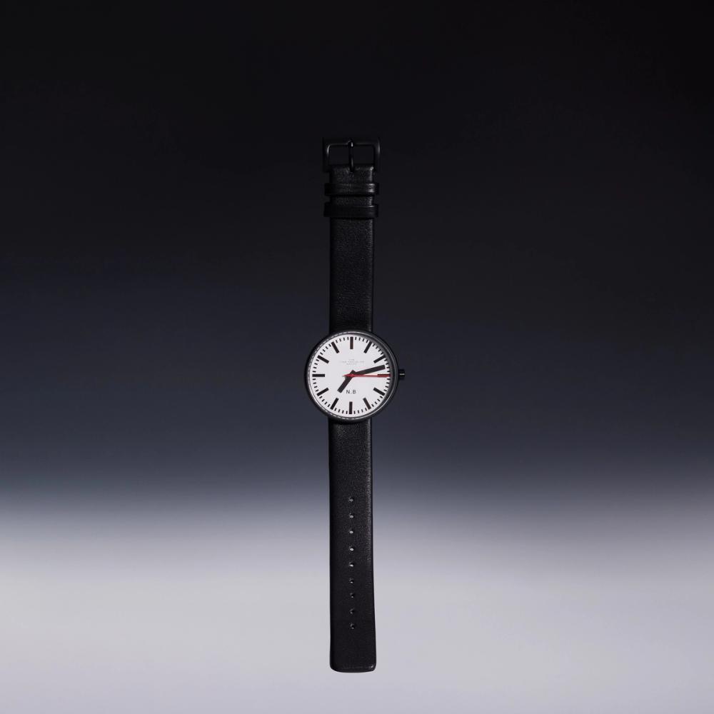 Wearable on its own or with the bag. The watch features a simple typeface and straightforward design. This minimal, thick black and white aesthetic is inspired by global trade and time keeping aesthetics in the post-WWII era.